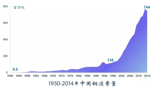 鋼鐵用量約占金屬消費(fèi)的75%,是工業(yè)的骨骼。鋼鐵是工業(yè)化過程中最重要的原材料之一,2014年中國消費(fèi)鋼鐵7.44億噸,是建國時(shí)的1240倍。